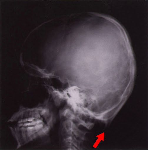 頭のレントゲンで後頭部の下の方に、小さな角のような骨が認められます。
